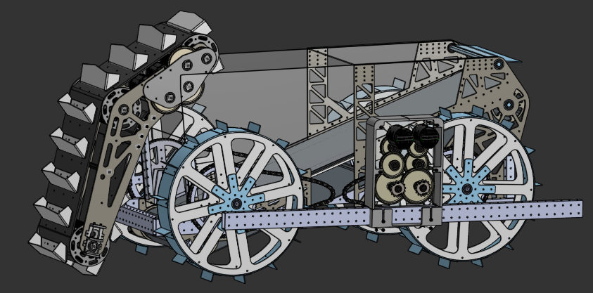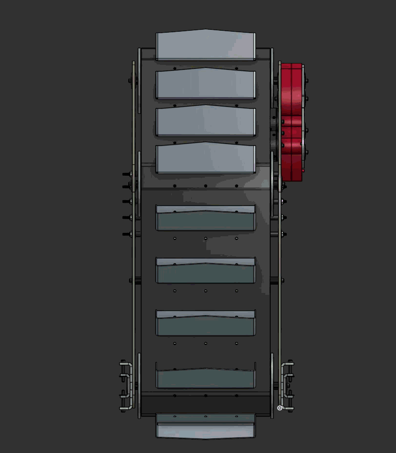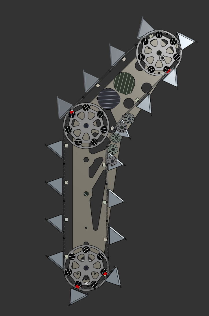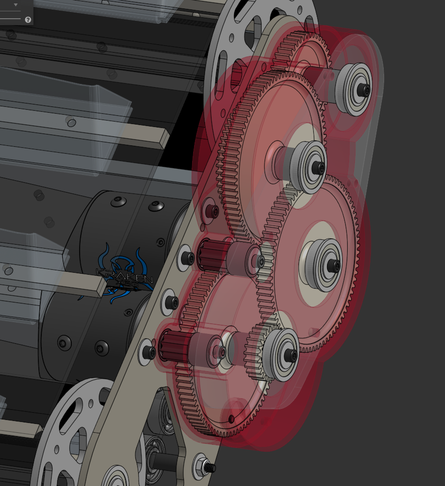 The belt is driven by two Kraken X60 motors. Last year’s rover used one X60 motor, and experienced run-compromising overheating issues. The motors are able to be water-cooled, but that would add complexity to our rover. Instead, we opted to using two Kraken X60 motors that will be housed in between the belt in the upper portion of the system.
